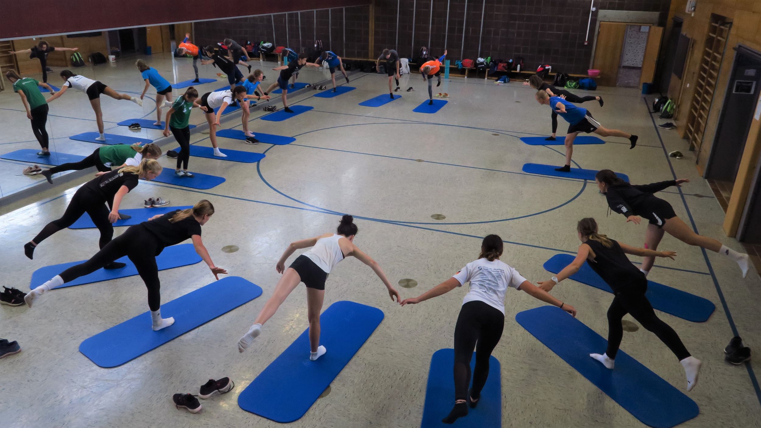 Das Wetter sorgte schließlich dafür, dass auch das im „Talentförder“-Vortrag von Christian Hummel als äußerst wichtig angesprochene allgemeine Grundlagentraining nicht zu kurz kam. War in Steinbach vor zwei Wochen die HItze nachmittags kaum zu ertragen, sorgte in Albstadt gleich am ersten Tag ein kräftiger Sturm für einen energischen Spurt zurück in die Halle. Dort widmete sich dann wie auch an den etwas regnerischen anderen beiden Tagen ausgiebig der Gleichgewichtsschulung, der Mobilisierung von Hüfte und Wirbelsäule und der Kräftigung und Beweglichkeit der Füße, was den einen oder anderen fast verzweifeln ließ.