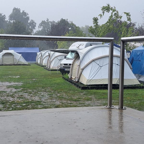 Innerhalb von 48 Stunden gingen über dem Tessin Unmengen an Regen nieder, so dass nicht nur der Rhein auf dem Weg zum Bernardino unheimlich anschwoll, sondern auch der Camping-Platz des Centro Sportivo bis zum Montagabend unter Wasser stand. Ein großes Lob an die Jungs, die ihren Vierfach-Umzug, um die mitgebrachten Zelte trocken auf- und dann wieder abzubauen, einigermaßen gelassen hinnahmen.