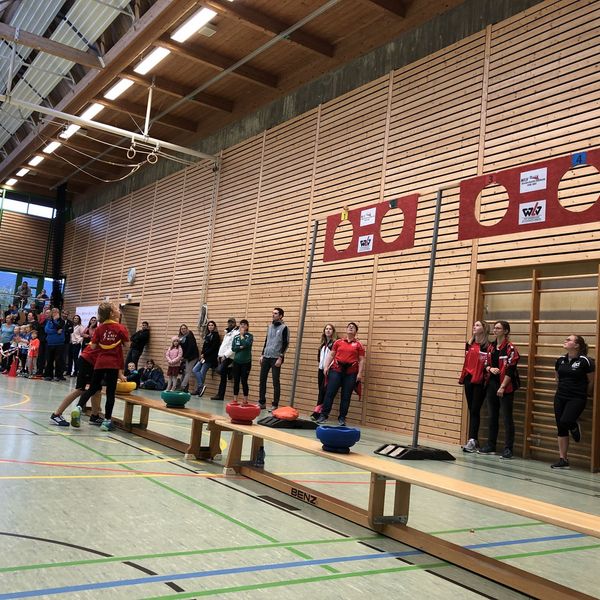 Viele Linien im Abstand von 50 Zentimeter waren für den Medizinballstoß vom eifrigen Team des SV Nufringen bereits am Vorabend auf den Hallenboden geklebt worden. Bei dieser Disziplin musste der ein Kilogramm schwere Medizinball möglichst weit gestoßen werden. Von drei Versuchen pro Kind wurden dabei die besten zwei aufaddiert. Auch hier war das spätere Siegerteam des SSV Ulm nicht zu schlagen. Dahinter erhielt das Team des LV Pliezhausen als zweibestes Team im Medizinballstoß zwei Rangplatzpunkte.