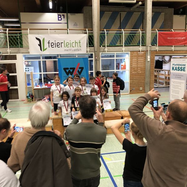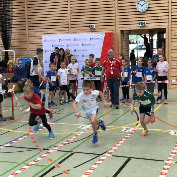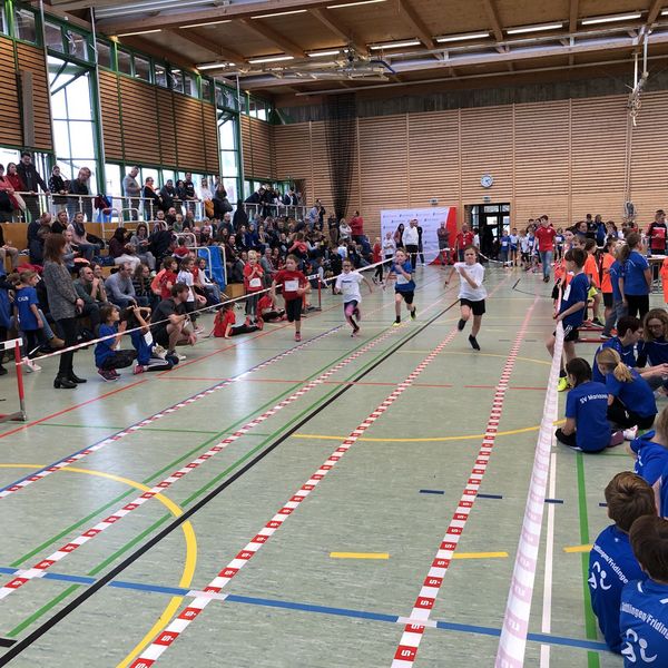 Nach den vier Disziplinen wurden alle Stationen abgebaut und die abschließende Biathlonstaffel mit der großen WLV-Zielscheibe aufgebaut. Nach einer kurzen Erklärung ging es dann auch direkt los. Immer zwei Kinder einer Mannschaft absolvierten gemeinsam eine Runde. An der Zielscheibe musste mit vier Würfen mindestens zweimal ins Ziel getroffen werden, ansonsten gab es eine kleine Strafrunde zu absolvieren. Die ganze Halle feuerte die Kinder an, sodass alle nochmals ihr Bestes gaben. Die schnellste Zeit erzielte dabei das Team des TSV Schmiden, die ohne Stafrunde geblieben waren. Da nur sechs Kinder pro Mannschaft laufen durften, gab es im Anschluss drei weitere Läufe mit gemischten Mannschaften, sodass am Ende jedes Kind einmal die Biathlonstaffel absolvieren durfte. Gleichzeitig nutzt das Wettkampfbüro die Zeit, um mit der offiziellen Kinderleichtathletik-Software des WLV "AthletePro Junior" blitzschnell die Auswertung vorzunehmen und die Urkunden zu drucken, sodass nur wenige Minuten nach dem letzten Staffellauf bereits die große Siegerehrung folgen konnte.