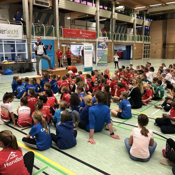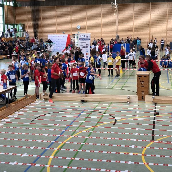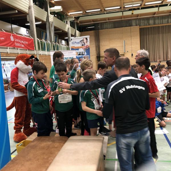 Kurz nach 12 Uhr füllte sich die Nufringer Schwabenlandhalle mehr und mehr mit aufgeregten Kindern aber auch unzähligen Trainer/innen, Eltern und Begleitpersonen. Zur Begrüßung versammelten sich dann die rund 190 Kinder der Altersklasse U10 im Innenraum und wurden von Andreas Surbeck und seinem erfahrenen Team des ausrichtenden SV Nufringen begrüßt. Auch WLV Bildungsreferent Rene Stauß freute sich über die große Resonanz und erklärte den aufmerksamen Kindern, dass sie zu den besten U10-Teams des ganzen Verbandes gehören. Unter freudiger Beobachtung von Bürgermeister Ingolf Welte starteten alle hochmotiviert mit einem gemeinsamen Aufwärmprogramm zu fetziger Musik. Danach ging es endlich los!