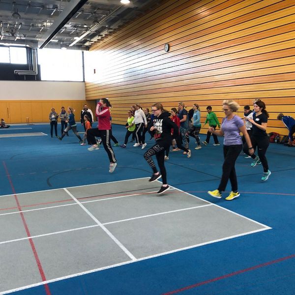Nach einem ausgiebigen Mittagessen im Sportrestaurant Neckarpark mit einer Vielzahl an interessanten Gesprächen und mit regem Austausch zwischen den Teilnehmerinnen ging es im Seminarraum weiter. Florian Bauder als Landestrainer Mehrkampf stellte zunächst in einer kurzweiligen Präsentation die Möglichkeiten und Varianten im Training mit größeren Gruppen vor,bevor es dann in der Halle an das praktische Üben und Ausprobieren ging.